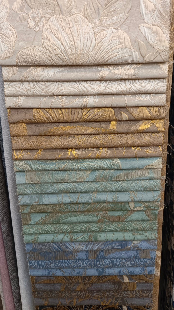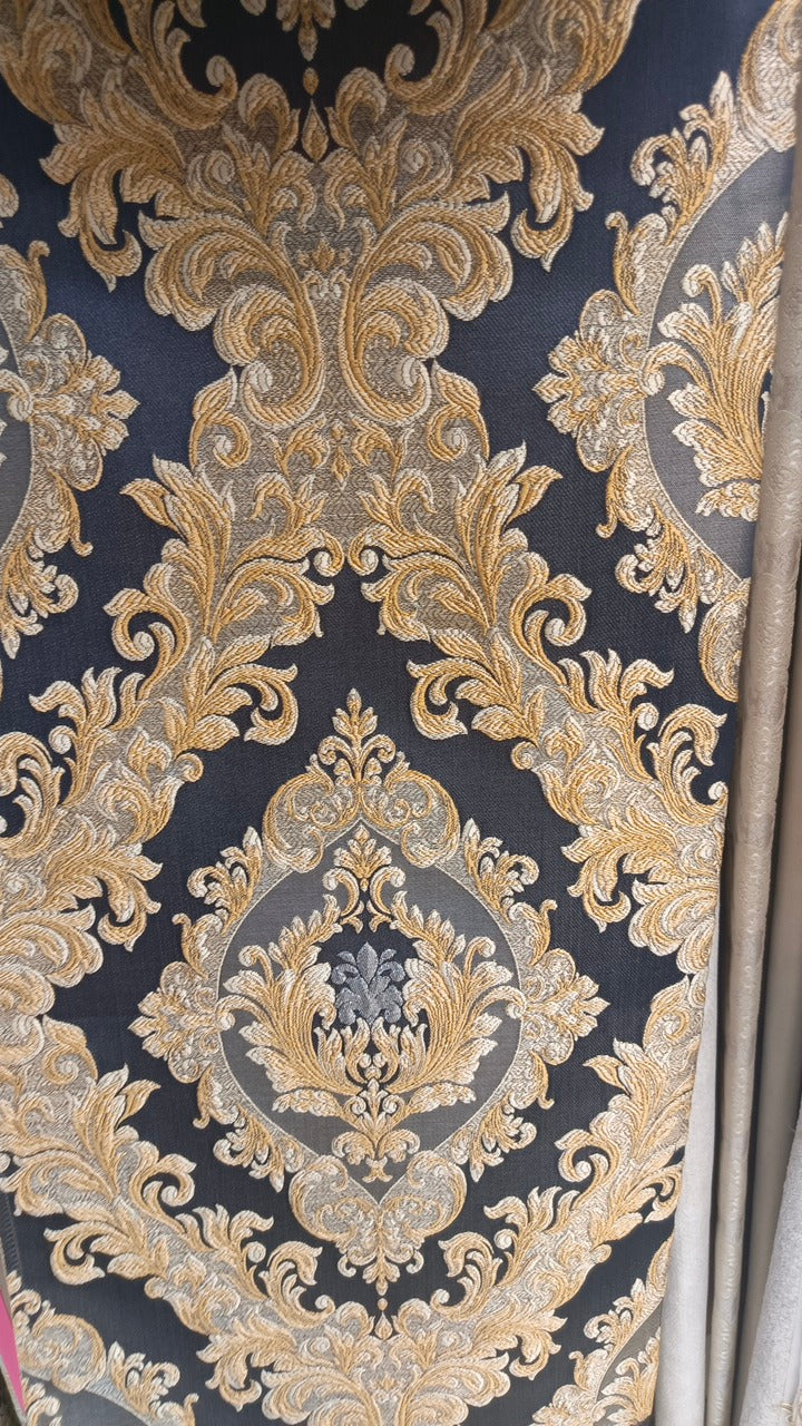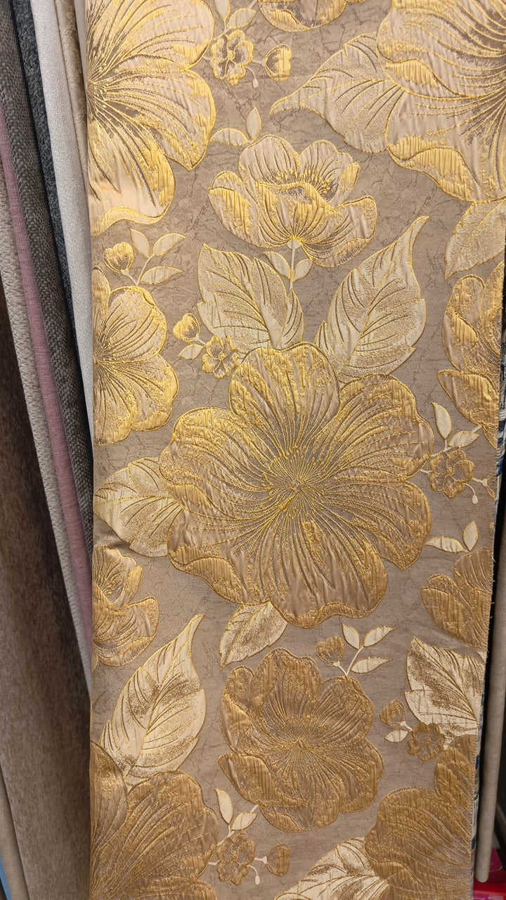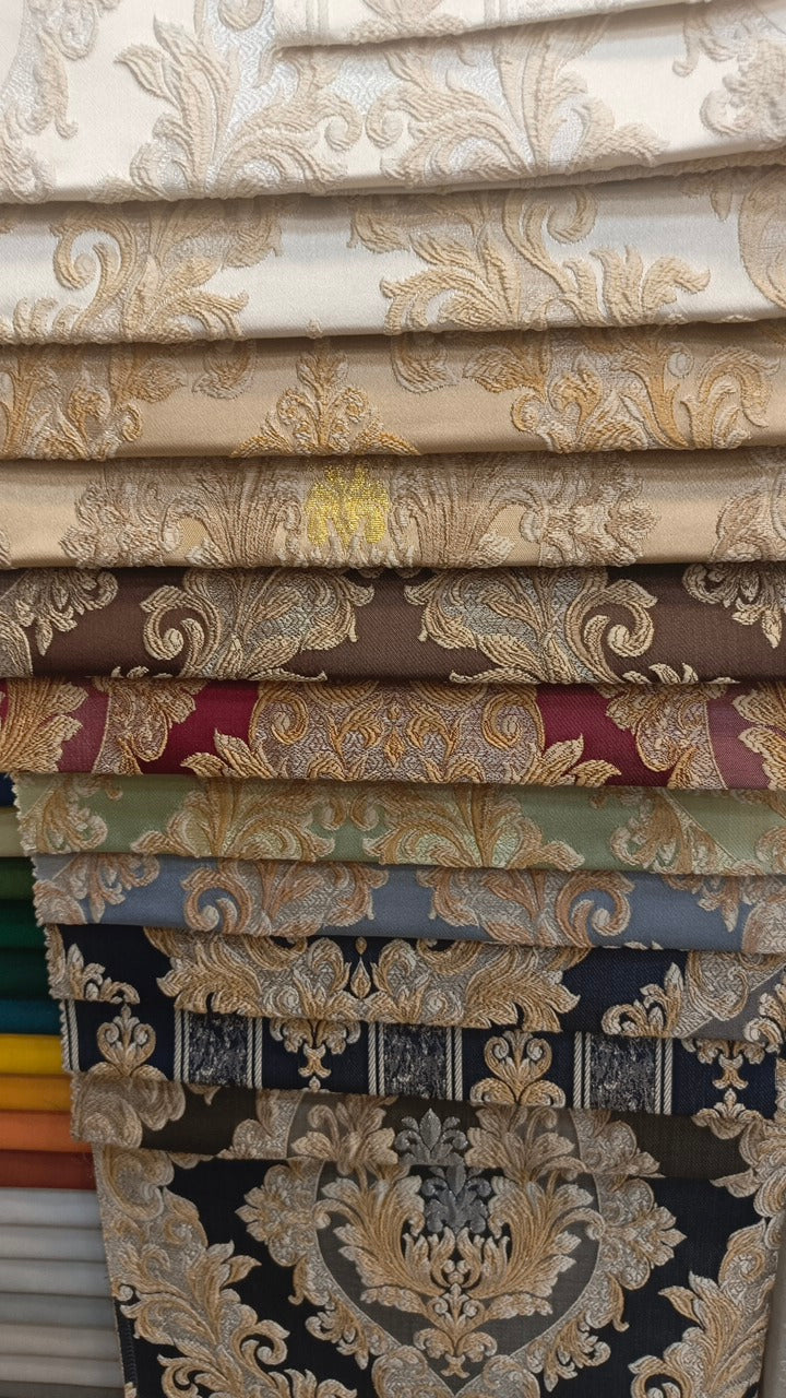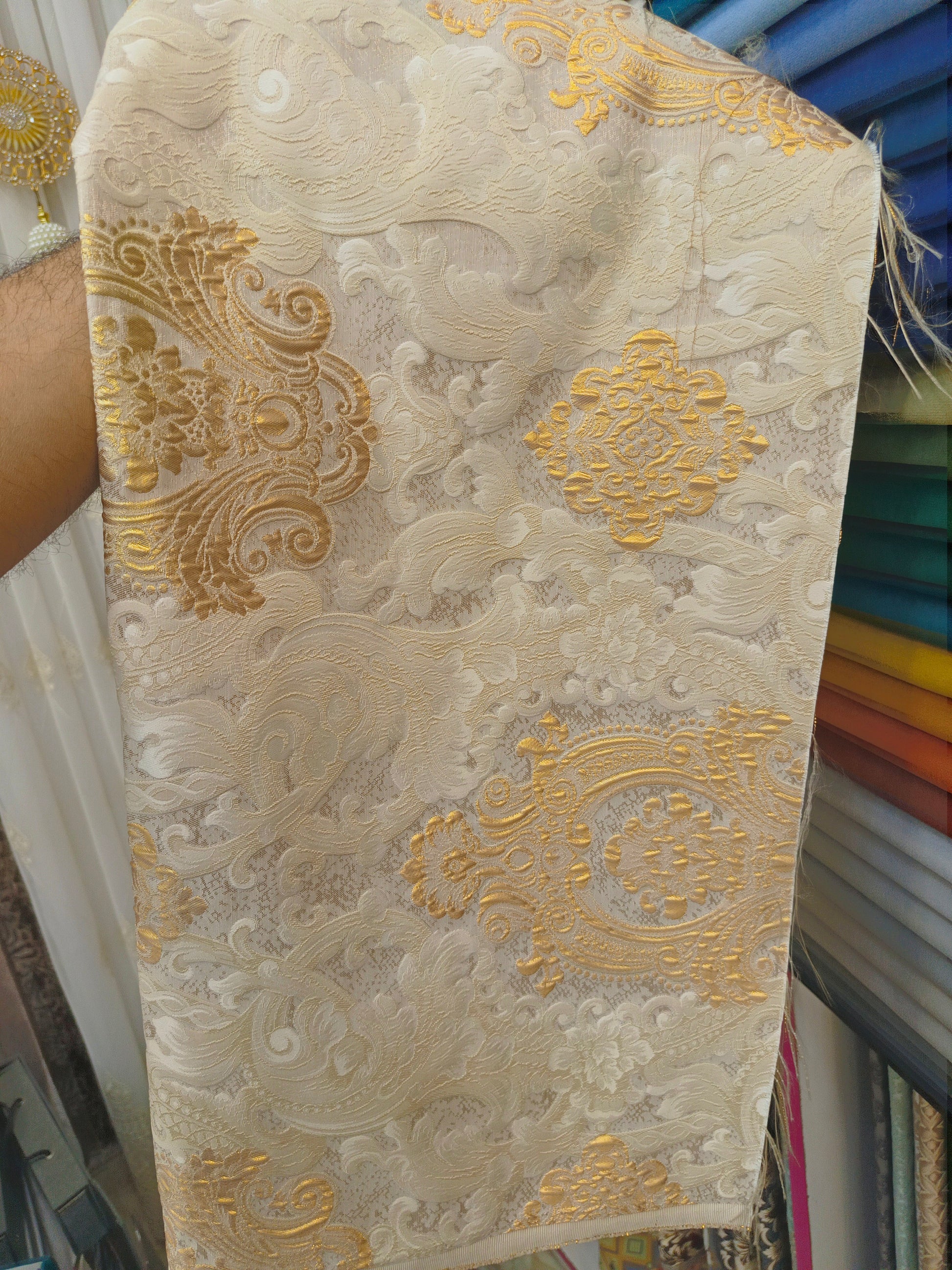 "أضيفي لمسة من الفخامة الملكية لغرفة المعيشة مع تشكيلة أقمشة الكنب المشجرة. تتميز بنقشات ذهبية بارزة وألوان غنية تناسب المجالس العربية الفاخرة."